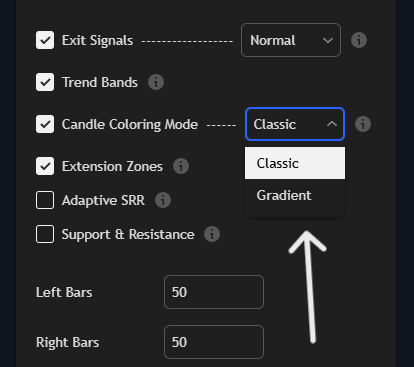 <figure><img src="https://554801738-files.gitbook.io/~/files/v0/b/gitbook-x-prod.appspot.com/o/spaces%2FvoQ4x79LJsB2zbXrQXqx%2Fuploads%2FBc1Geo9HAMb8zfsz2Xyf%2FScreenshot%202025-06-19%20172503.png?alt=media&#x26;token=00f4a6f9-9f23-4840-8b81-39133401d8df" alt=""><figcaption><p>Choose Between "Classic" and "Gradient" Candle Coloring Modes</p></figcaption></figure>