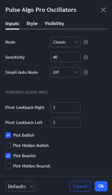 **Pulse Pro Oscillators** visualize underlying strength and divergence to help you identify underlying pressure in real-time. **Pulse Pro Oscillators** are fully adaptable to market conditions. **Custom settings** can be optimized directly through the **Pulse Algo Pro Oscillator Panel** to fit your specific trading style! Now fully featured with [**Simpli Auto Mode**](https://pulse-algo.gitbook.io/pulse-algo-pro-resources-and-docs/pulse-algo-pro-ecosystem/simpli-auto-mode) **for all Oscillator Modes**!